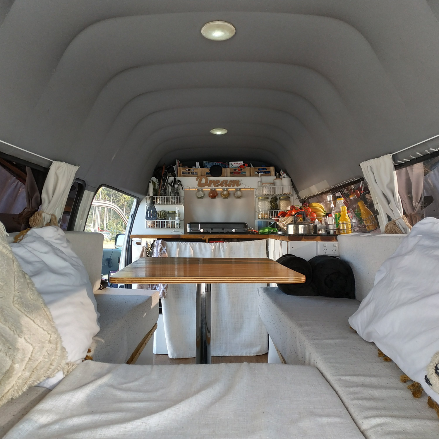 - avec une cuisine à l’intérieur et non à l’arrière : pareil, après avoir expérimenté d’autres vans, la cuisine derrière, à l’extérieure sous la porte du coffre c’est très bien quand il fait bon, mais nettement moins dans le cas inverse. On voulait pouvoir être autonomes dans le van.